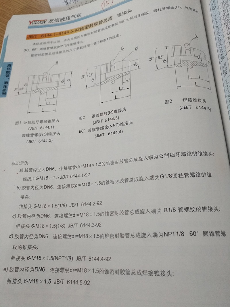 a)膠管內(nèi)徑為DN6,連接螺紋d1=M18*1.5的錐密封膠管總成旋入端為公制細牙螺紋的錐接頭:錐接頭6-M18*1.5 JB/T 6144.1-92